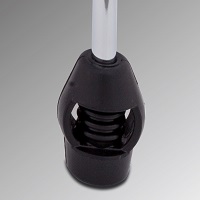 The steel leg is prevented from contacting the ground by an internal cotter pin, allowing the floor tom to “float” on the elevated “spring" of the rubber foot, eliminating vibration transfer and maximizing resonance.